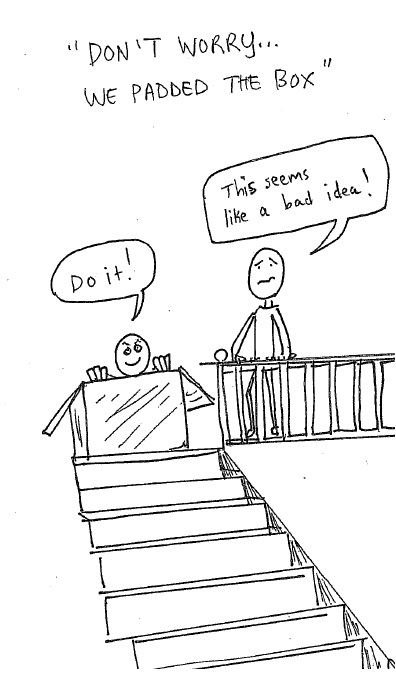 Back to Chris’ launch. The box slid perfectly down the stairs on its back surface. It looked like Chris did reach terminal velocity. Strangely, though, the box did NOT make a 90 degree turn to the left upon reaching the floor. The box DID stand straight up and catapulted Chris head first into the corner of the wall between the foyer and living room. We would have been better off taping the pillows directly to Chris’ head…